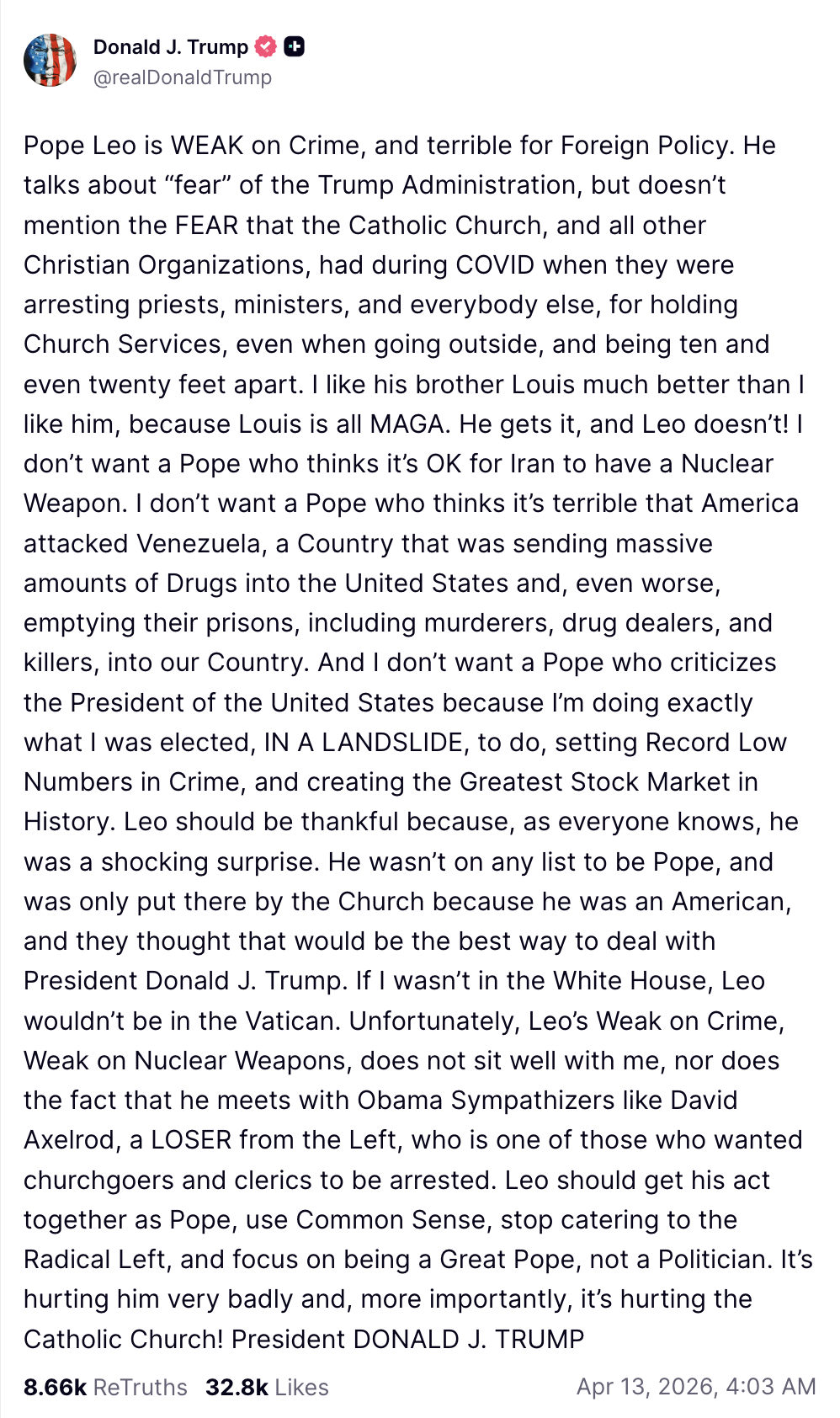 “Papa Leon este slab în ceea ce privește criminalitatea”